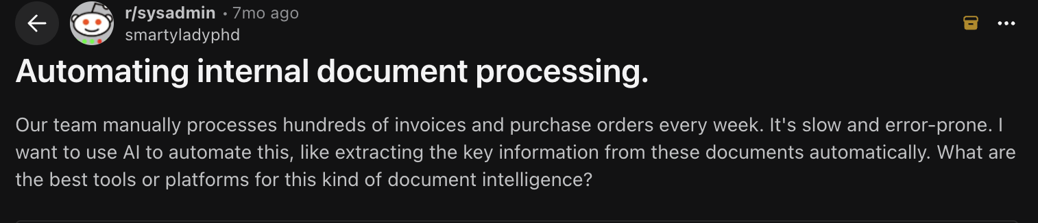 The pattern shows up in practitioner communities too. Threads in r/sysadmin regularly surface the same complaint: teams implement document automation, watch it work for clean inputs, and then quietly build a correction layer on top for everything else. The automation is real, but so is the manual layer sitting on top of it.
