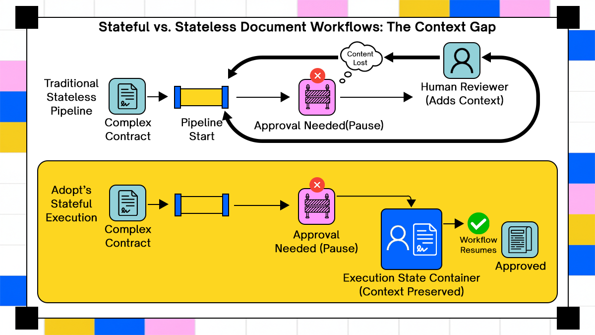 These workflows require pause, resume, rollback, and audit capabilities. Treating them as stateless jobs means losing context every time the process pauses. When it resumes, it restarts without knowing what happened before, what human decisions were made, or why certain document versions were rejected. The automation becomes a series of disconnected extraction events rather than a coherent process.