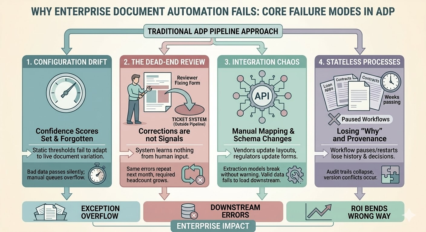 Human review that exists outside the execution model is a dead end, not a feedback loop. It absorbs labor, fixes individual documents, and leaves the underlying problem intact. These component-level problems compound into recognizable failure patterns that show up across almost every enterprise ADP deployment. The next section covers those patterns, because knowing them is half the diagnosis.